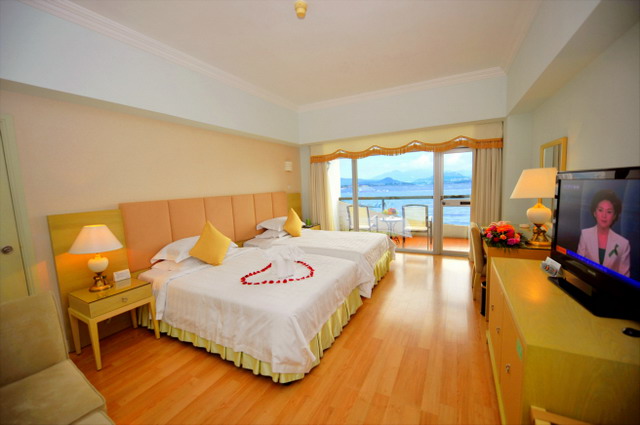 豪華海景雙床房 面積:39-45平方米 樓層:2-8層 海景:180度海景 陽(yáng)臺(tái):觀海陽(yáng)臺(tái) 雙標(biāo):1.3*2米 浴缸:大部分房間有 寬帶:免費(fèi)