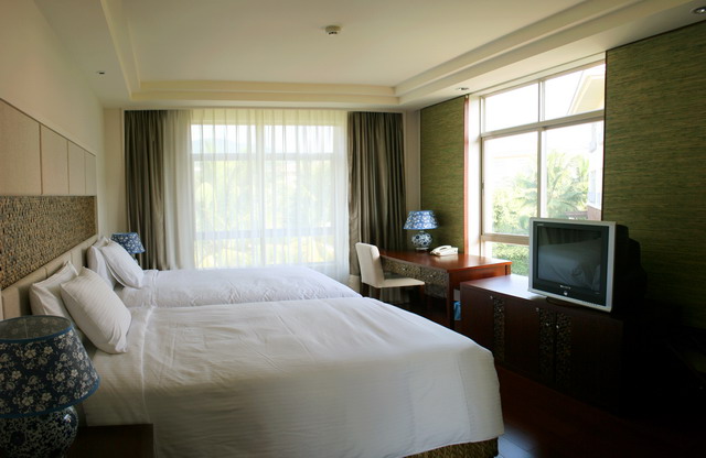 聯(lián)排別墅房:分布于1-3層,無陽臺(tái),有浴缸,房間面積23平方米,大床(2*2米),雙床(1.2*2米),免費(fèi)寬帶
