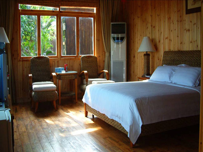 三亞蜈支洲島度假中心屬熱帶海洋性氣候,全年溫和氣爽,四季怡人。由于小島地處三亞海棠灣,避開了臺風(fēng)走廊,所以不同于一般只能生長灌木的北部小島,這里喬木高大挺拔,灌木繁茂葳蕤,如天然織就的一塊厚重的綠毯披在島上,麗質(zhì)天成。小島地貌美麗而有層次:島的中部坡地逶迤,起伏平緩,草木紛亂,藤蔓纏結(jié),花紫果綠,蟬噪鳥鳴。西部及北部平緩延伸入海,形成一彎路玉帶狀的銀色沙灘,沙質(zhì)均勻細膩,色澤潔白如雪,海水由淺入深,顏色由透明而碧綠繼而淺藍,后而深藍,明麗動人層次分明。東部與南部則是現(xiàn)兩峰相連,最高峰海拔79.9米,其氣勢與洶涌仄相向,懸崖壁立如削,人跡難至,其下礁石林立,奇形萬狀,驚濤拍岸,泡沫如雪。大風(fēng)或大潮時,海浪咆哮奔騰激起的浪花可高達十米,形成獨特的山海奇觀。小島現(xiàn)已被開發(fā)了三分之一,都位于西北部。建設(shè)者獨具匠心,巧妙地利用了地形地貌,使人工設(shè)施掩映期間,不減其風(fēng)采,反增其情趣。這里椰影婆娑,綠草成蔭,竹制建筑娉婷綽約,泳池碧波蕩漾。草地上小徑蜿蜒,點綴些秋千、蹺蹺板、石凳、竹制躺椅,編就了一幅世外天堂的畫面。